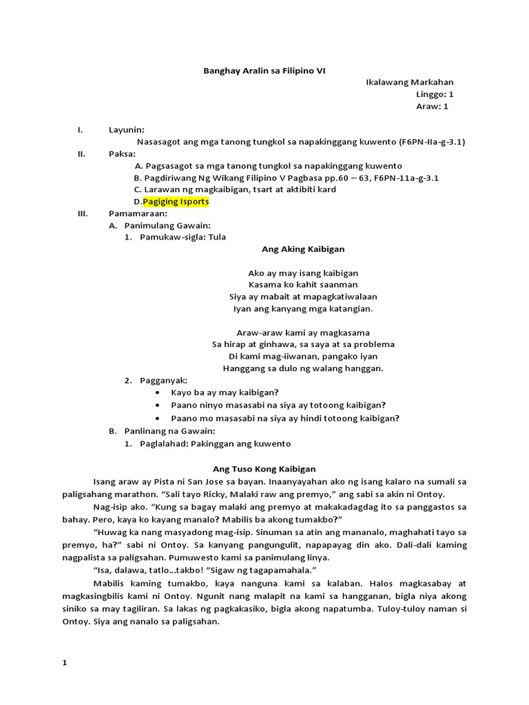 Banghay Aralin Filipino 6 2nd Grading Week 1