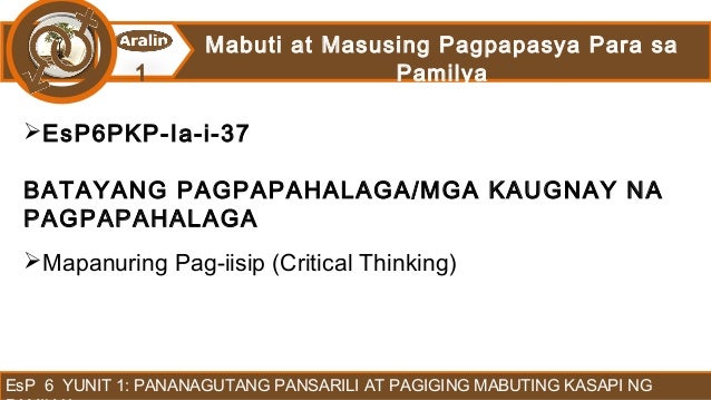 PANANAGUTANG PANSARILI AT MABUTING KASAPI NG PAMILYA 41 BATAYANG PANGNILALAMAN Naipamamalas ang pag-unawa sa kahalagahan ng pagkakaroon ng mapanuring pag-iisip sa pagpapahayag at pagganap ng anumang gawain na may kinalaman sa sarili at sa pamilyang. Ang isay mahilig sa kasayahan at buhay na marangya samantalang ang isa namay mahilig sa pagtatanim sa bukid at pag-aasikaso sa mga. Ito ay umaasa sa isip dahil nasa isip lamang ang katuwiran para ma impluwensyahan ang isang kilos.