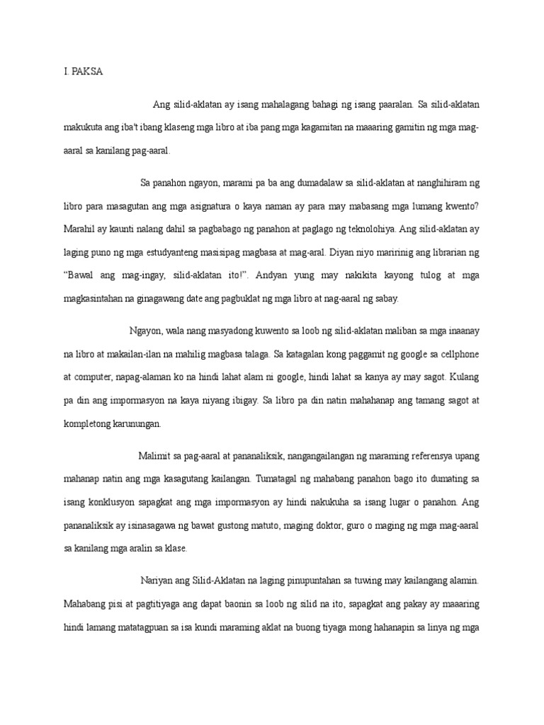 Check out our top Free Essays on Kahalagahan Ng Pag Aaral Ng Silid Aklatan to help you write your own Essay. Anu-ano ba ang mga dapat ginagawa sa loob ng silid-aklatan. PAGGAMIT NG MGA SANGGUNIAN AT SILID-AKLATAN 3.