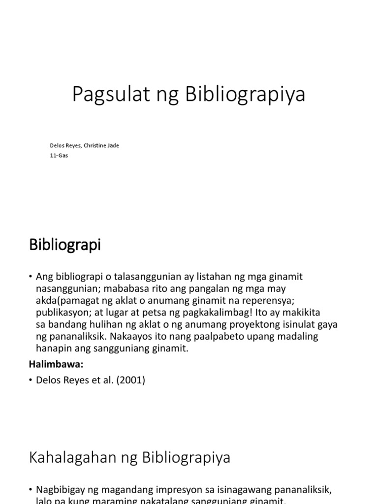 Matatagpuan dito ang pangalan ng awtor na nauuna ang apelyido pamagat ng aklatmagasin artikulo pangalan ng magasinpahayagan lugar ng pinaglimbagan taon ng pagkalimbag at pahina. Hindi na kailangang isama ang taon kung kailan nailimbag ang sanggunian. Ang bibliograpiya ay listahan ng mga ginamit na sangguniang aklat pahayagan magasin at iba pa na inaayos nang paalpabeto.