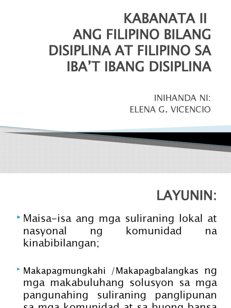 Filipino ang 15 Ikatlo 23 gawing pangunahing midyum sa pagtuturo lalo na sa mababang lebel ng. BILANG bahagi ng proyekto ng Komisyon sa Wikang Filipino KWF na Aklat ng Bayan sinsimulan nang isalin sa wikang Filipino ang mga akda mula sa ibat ibang disiplinapilosopiya kasaysayan antropolohiyapati ang mga banyagang akda.