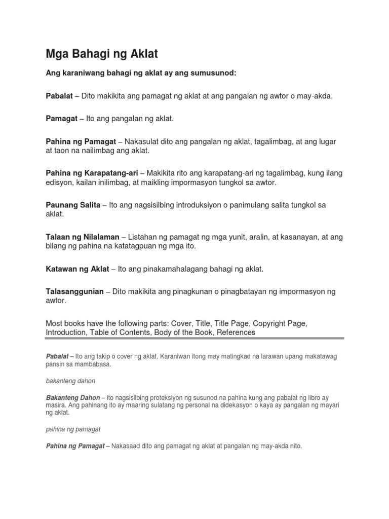 Pag-aalay o Pasasalamat Dedikasyon. Pabalat pahina ng pamagat pahina ng karapatang sipi paunang salita talaan ng nilalaman katawaan na aklat glosari indeks. Pahina ng Pamagat dito naman nalalaman ang pangalan ng awtor na nagsulat ng aklat ang pamagat ng aklat at ang ngalan ng palimbagan.
