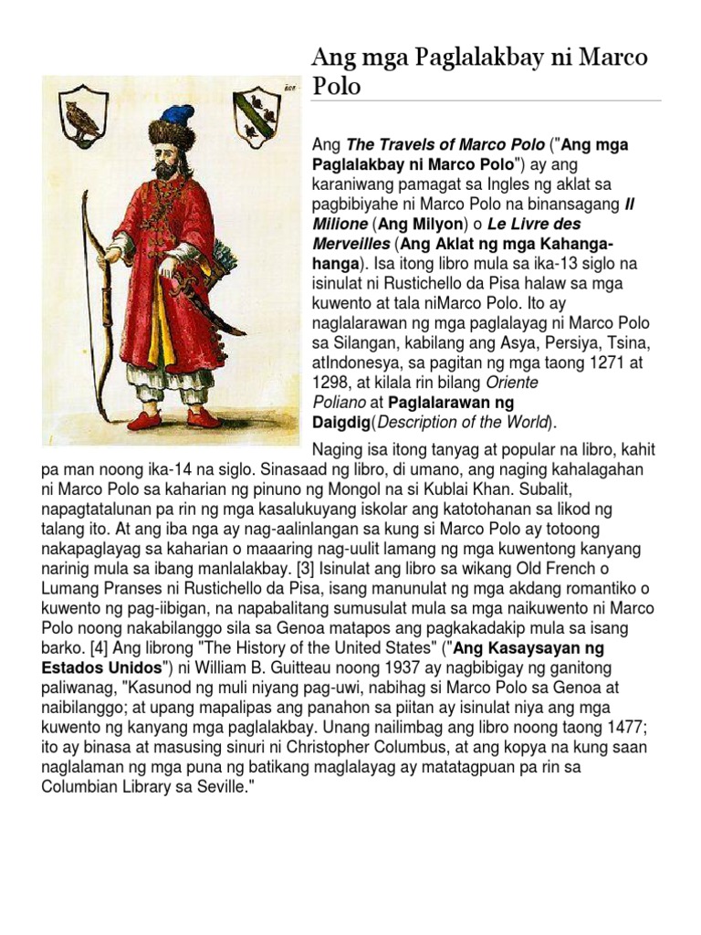 Ang The Travels of Marco Polo Ang mga Paglalakbay ni Marco Polo ay ang karaniwang pamagat sa Ingles ng aklat sa pagbibiyahe niMarco Polo na binansagang Il Milione AngMilyon o Le Livre des Merveilles Ang Aklat ng mga. Siya ay anak ng isang mangangalakal na anglakbay patungong China Araling Panlipunan 7 50. Si Marco Polo c.