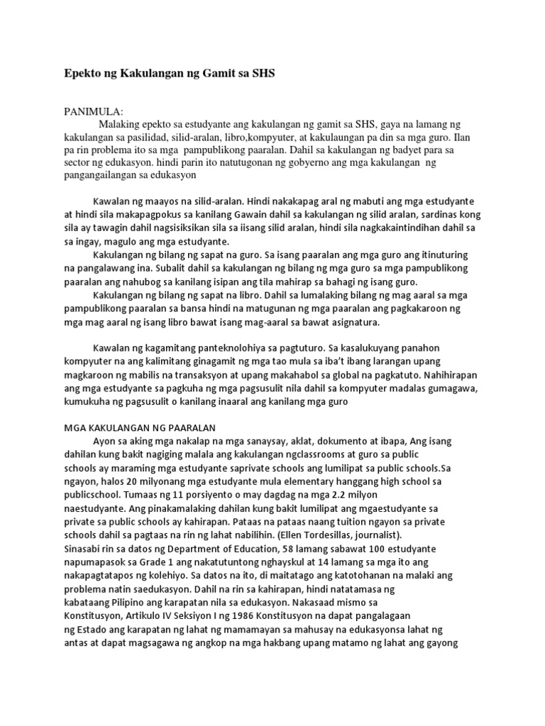 Epekto Ng Kakulangan Ng Gamit Sa Shs