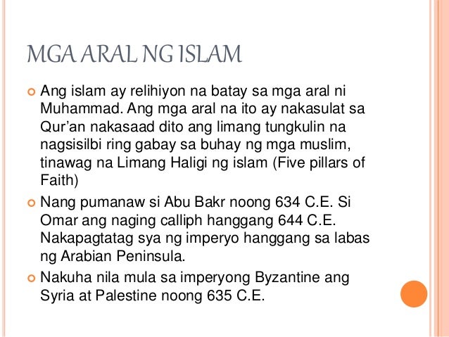 Mga Paniniwala at Aral ng Islam Ang Koran ang banal na aklat ng mga Muslim na tunay na salita ni Allah galing kay Muhammad sa pamamagitan ni angel GabrielIsa lang ang Diyos na si Allah at si Muham- mad ang kanyang propetaHindi sila maaaring kumain ng baboy at hamon at uminom ng alakAng lalaki ay maaaring magkaroon ng. Mahalagang isaalang-alang natin ang mga paksang dapat talakayin upang ganap nating maabot ang layunin ng aklat na ito. Kanlurang Asya 13 Saan nagsimula ang Islam.